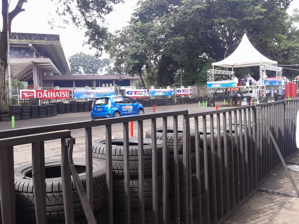 Kami mendapatkan voucher untuk dituker pembelian makan, dan juga bisa hang-out di Tenda bloggers yang ada di dekat pintu masuk. Ajang test drive ada di kiri pintu masuk, beserta dengan foodcourt ala Sirion Slalom yang dibeli dengan voucher tiket. Di sebelah kanan area kompetisi. Lengkap dengan tribun penonton yang ramai.