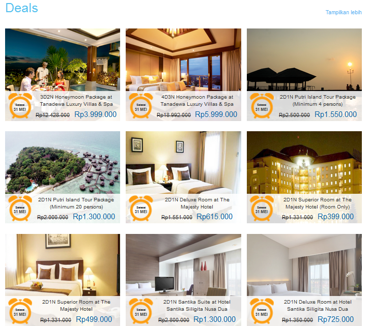 Di sebelah kanan, ada feature deal yang menarik buat kamu. Selain paketan hotel yang seru dan bisa kamu ambil untuk honeymoon, paket hemat, juga ada deal sewa mobil yang hemat dan memuaskan, paket tour-tour ke tempata wisata pun tersedia. DI homepage ini, muncul satu rekomendasi. Lengkapnya bisa kamu klik di menu DEAL.
