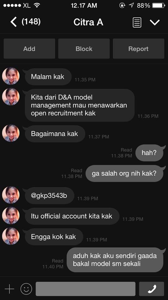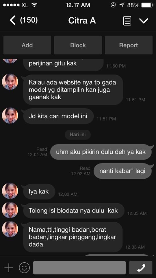 Berikut ini pengalaman terkini modus predator anak dari seorang orangtua yang anaknya di-modus-in oleh penjahat dengan berpura-pura ingin merekrut sebagai model. Untungnya, anak tidak menanggapi. Makin ke-ujung, makin keliatan modusnya. Anak yang terlanjur “excited” mungkin terjebak, sehingga kita baik orang tua maupun remaja harus senantiasa waspada.