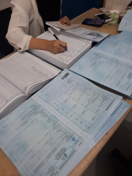 Berkas tadi, taruh aja di meja ini terus duduk. Nanti diambil petugas berpakaian putih. Pasrah aja, karena yang naroh kan ngasal, ada yang ditumpuk ada yang disamping. Ngga jelas urutan berkasnya.