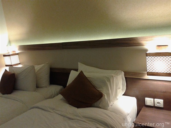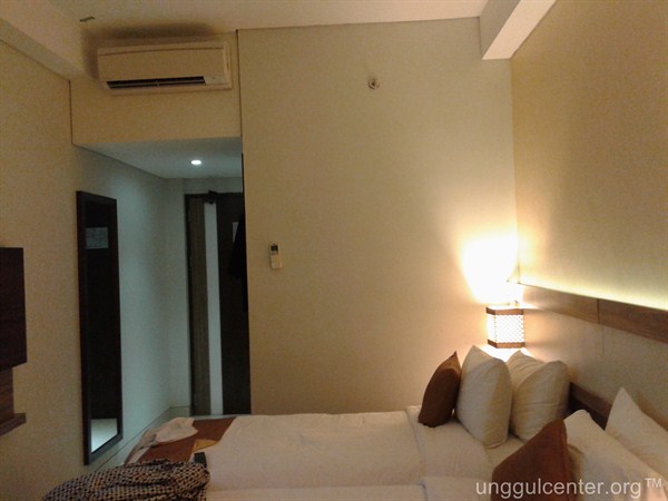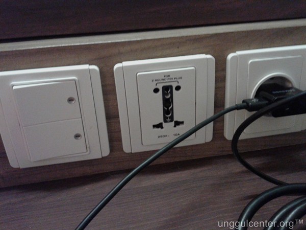 Kita tengok dulu kamarnya ya. Kamar ini yang saya suka adalah fasilitas colokannya. Di meja, selain colokan yang standard Indonesia, juga ada di tengahnya jenis colokan yang multil fungsi. Bisa model AS maupun juga colokan lokal Indonesia/Eropa tanpa harus adaptasi.