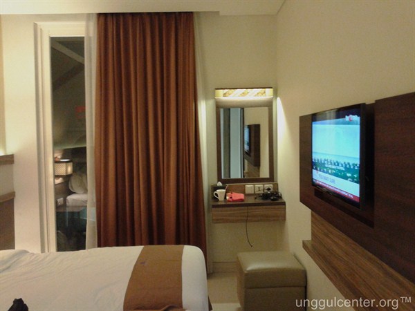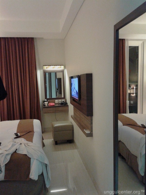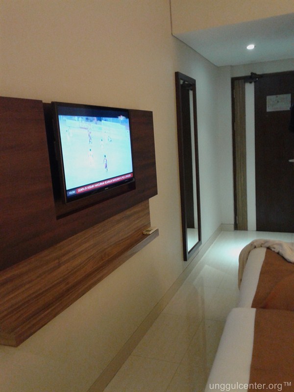 Kamar ini termasuk sempit sih, dengan jarak dari ranjang ke dinding hanya sekitar 1 meter kurang. Televisi memang nyantol ke dinding, sehingga tidak mengganggu. Untuk ukuran bujet seperti ini, ya lumayanlah. Toh kita ngga berniat berlama-lama di kamar.