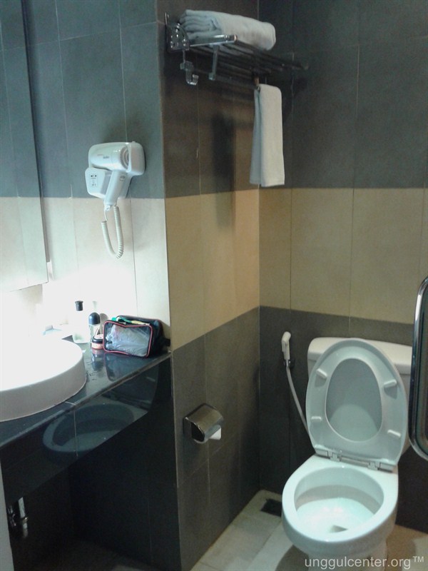 Kamar mandi, bath amenities nya lumayan. Walau kecil, lumayan nyaman.  Tentu ngga ada bath tub, namun shower panas-dingin tersedia dan lancar. Namun, Kamar Mandi tersebut, kebetulan, entah apa kamar saya aja, atau setting-nya memang demikian, pintu kaca-nya untuk shower hanya separuh. Hal ini menyebabkan ketika mandi, air muncrat sampai ke daerah di sekitar toilet.